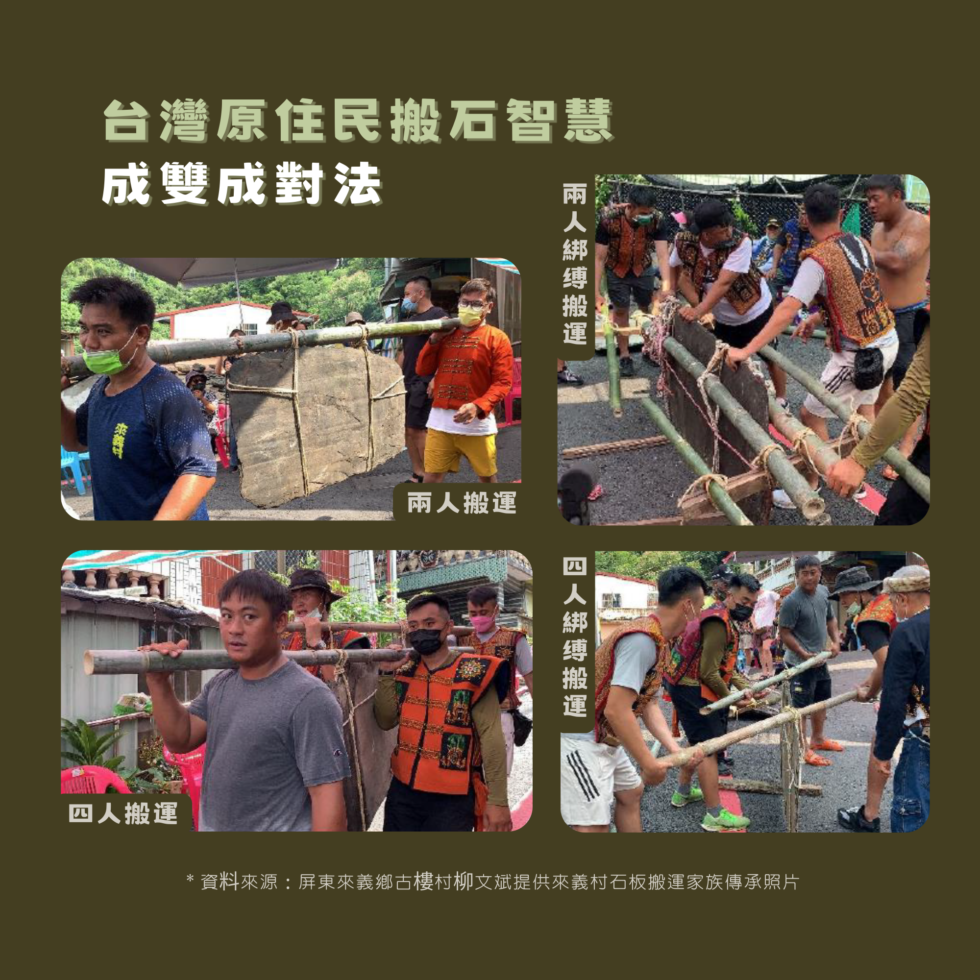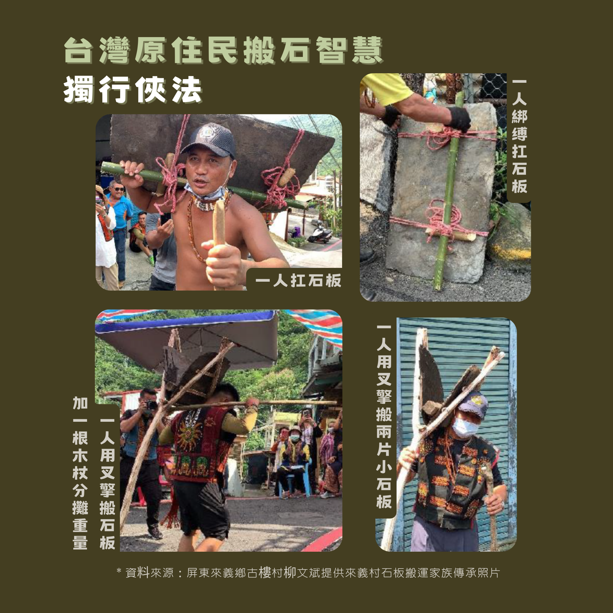 2024年我們從來義古樓村柳文斌老師那裡,取得了一批來義村傳承石板背負的照片,這樣的搬運方式,我們倒是還沒有機會試。