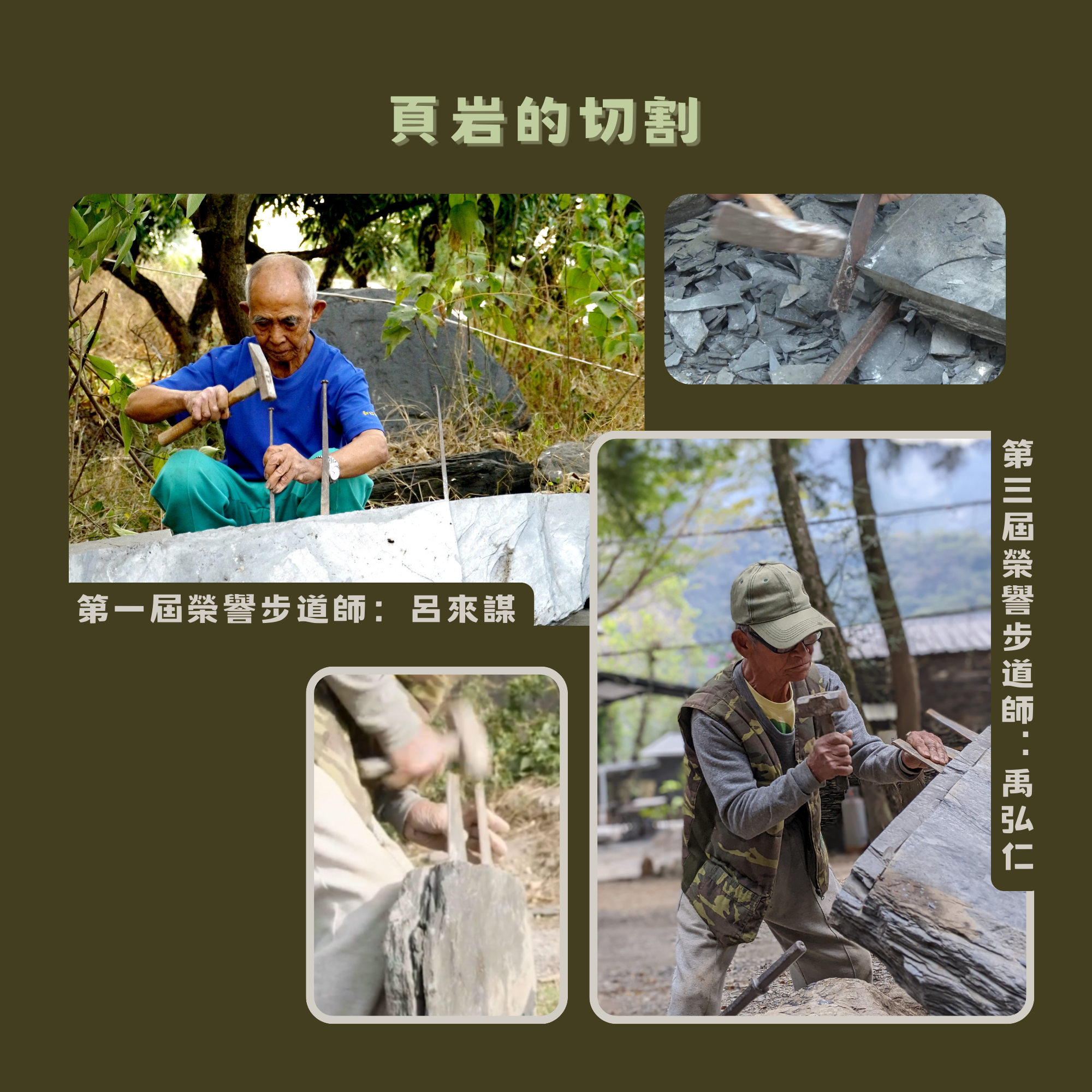 但是頁岩的質地跟其他石頭不同,所以這裡的鑿子是扁扁的,第三屆榮譽步道師禹弘仁就有一個非常精采的示範。
