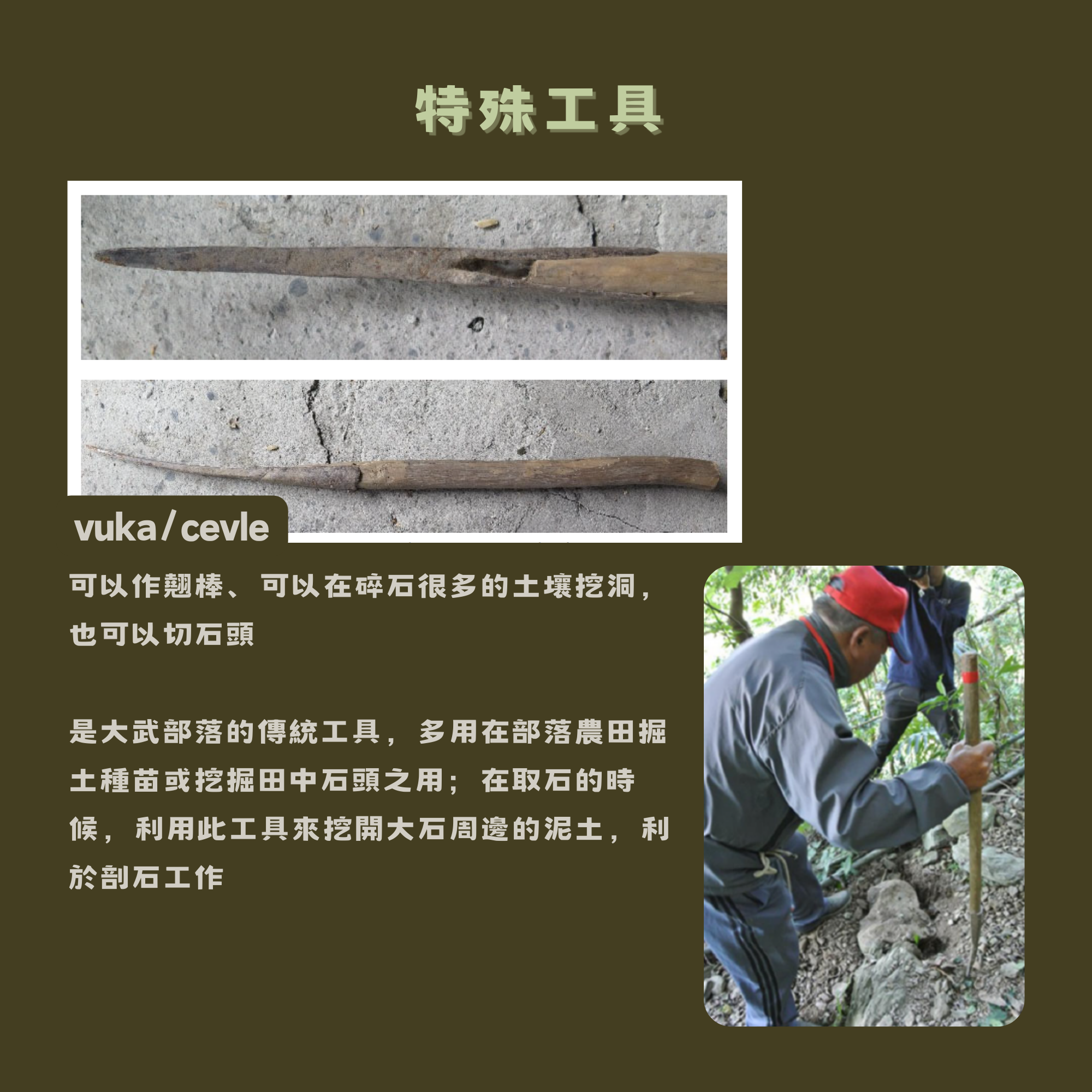 後來我們從三屆榮譽步道師身上學習到,這支掘棒在排灣族語叫作vuka,在魯凱族稱之為cevele,至今我還沒在其他地方看過。後來當我們在頁岩的環境工作,發現這種工具還是最好用。
