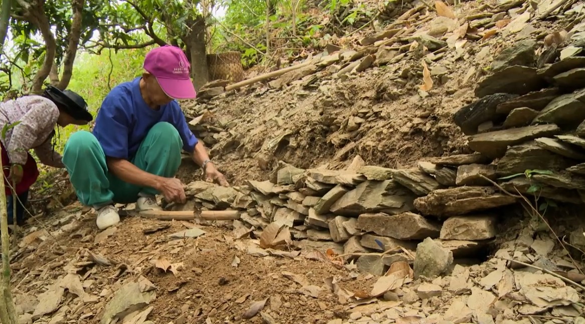 與蓋房不同,駁坎堆疊時需有角度,才不易於雨水沖走,最後疊最大塊石,用於休息舒適