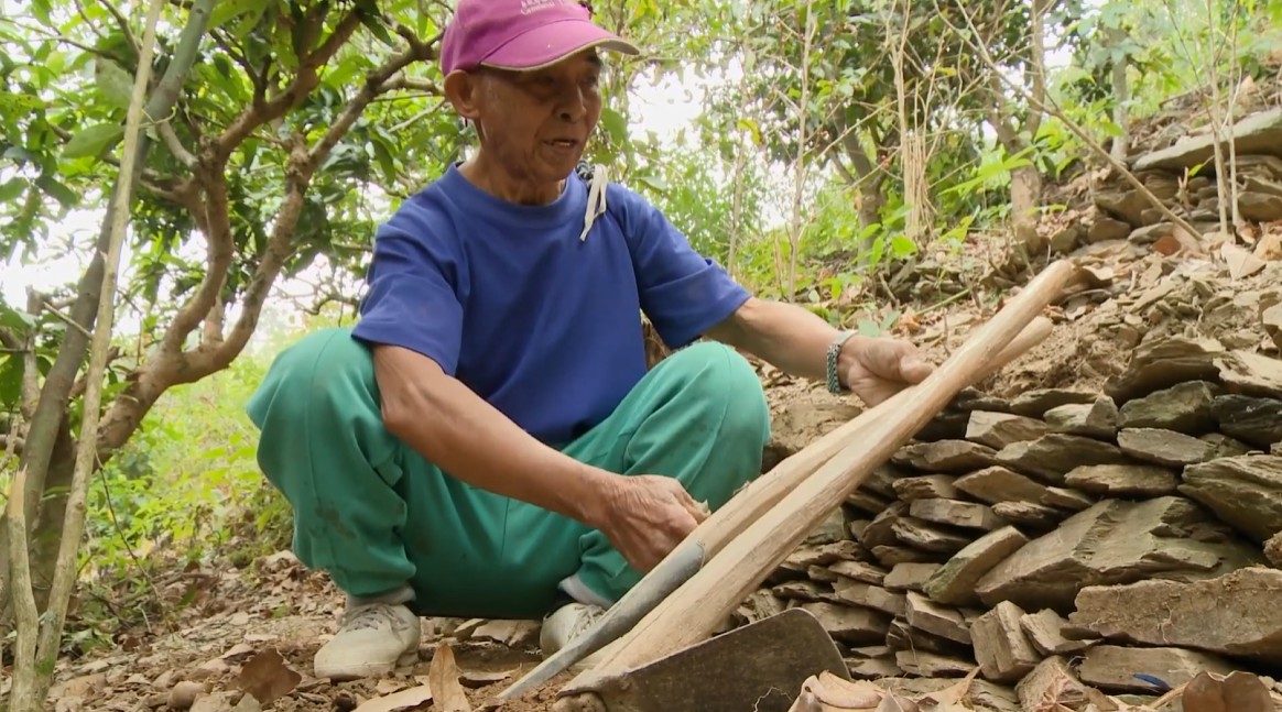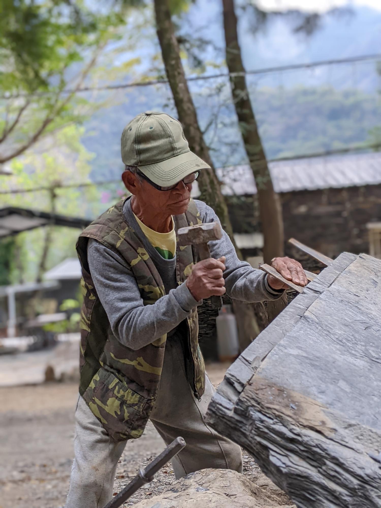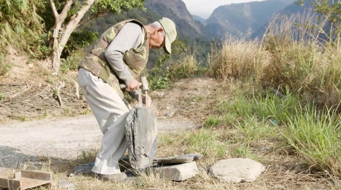 當他紮起馬步,用鐵鎚(pangulru)精準打擊鑿子(aipi)剖開巨岩時,那種與岩石共振的聲音震撼人心。他手中那支傳承自父親、因數十載而彎曲的鐵鍬棒(kanabu),依舊稱手。他在獵人古道上留下的每一處修補痕跡,都展現了歷經地質與歲月淬鍊後,那份堅毅且謙遜的靈魂。