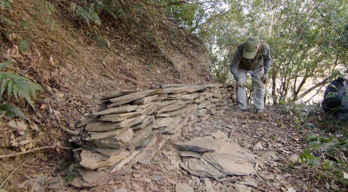 他口中的石板是有性別的:巧妙善用「公石」(sawvalay)與「母石」(ababay)的不同特性進行鑿切疊砌,互補嵌合。在莫拉克風災後,長老帶領年輕族人重建 Sasadra 古道,每一塊石板都蘊藏了幾世代的汗水。對長老來說,石板不是冰冷的建材,而是生活與記憶的延伸。
