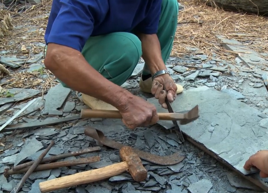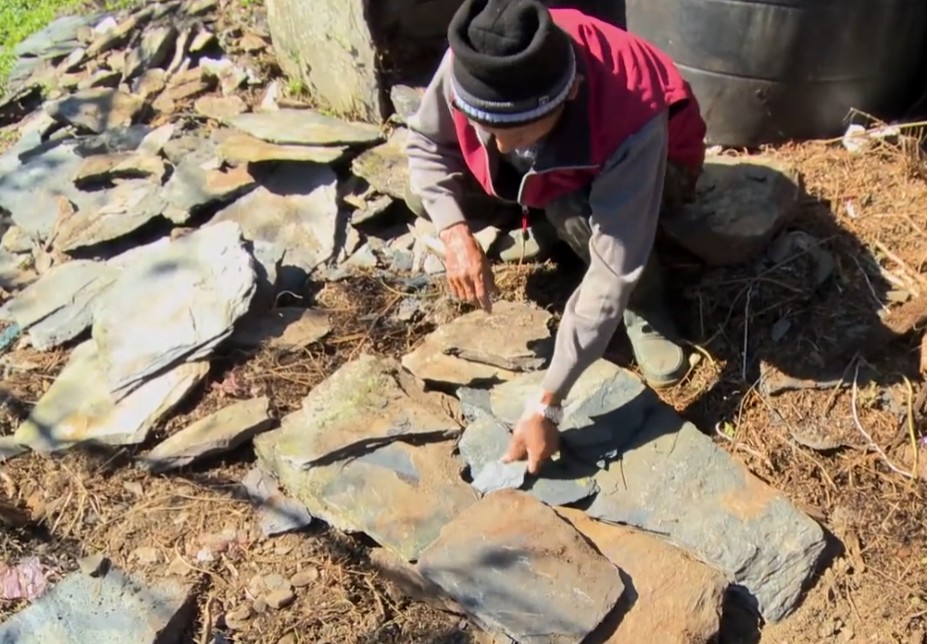 雖然科學上都叫板頁岩,但師傅會區分成:公石—顏色較深、質地清脆、聲音響亮,適合做為石板屋的屋頂,因為它夠硬且防水性佳。母石—顏色較淺、質地較鬆散,容易風化,通常用來砌築較不負重的擋土牆或農耕邊坡。