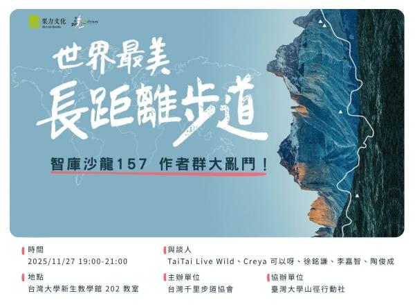 11月27號,我們將邀請本書的作者群,暢談世界五大洲的長距離步道,歡迎大家來買書聊書聊步道!