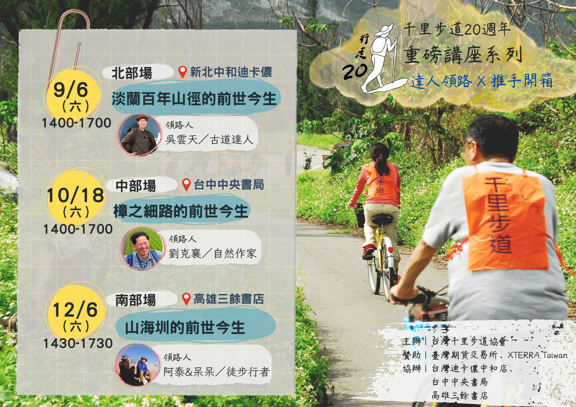 主辦單位|台灣千里步道協會 贊助單位|Xterra Taiwan、臺灣期貨交易所 協辦單位|台灣迪卡儂中和店、台中中央書局、高雄三餘書店、臺南社區大學台江分校、雲林記憶Cool